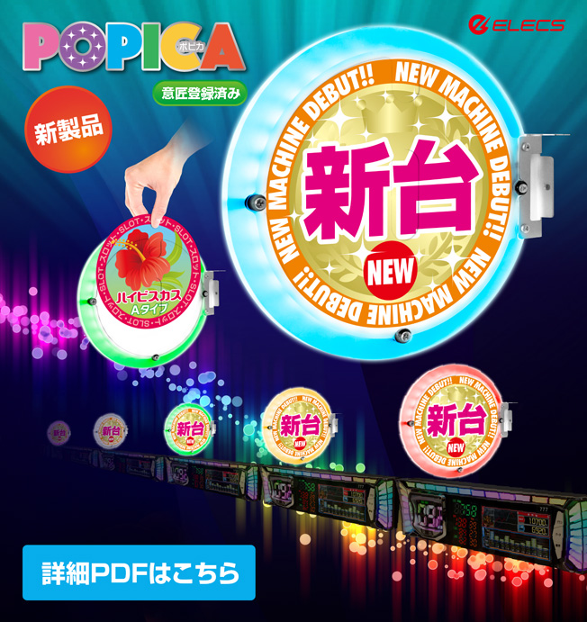 エレクス円形POP表示器「POPICA(ポピカ)」はPOPの外周をリング状にイルミネーション発光可能な円形両面POP表示器です。POPはカラーコピーなどを差し込むだけの簡単シンプル設計。 新台PRや機種別・コーナー別表示、店内広告などにぜひご活用下さい。
